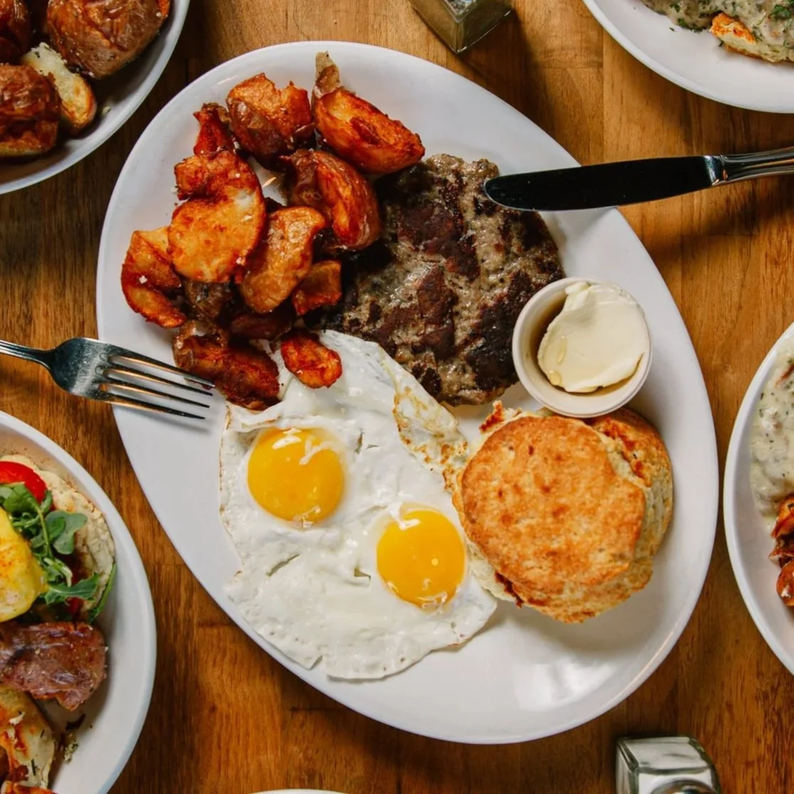 Two eggs, buttermilk biscuit with honey butter, crispy garlic rosemary potatoes adn your choice of our cayenne maple sausage patty or applewood smoked bacon