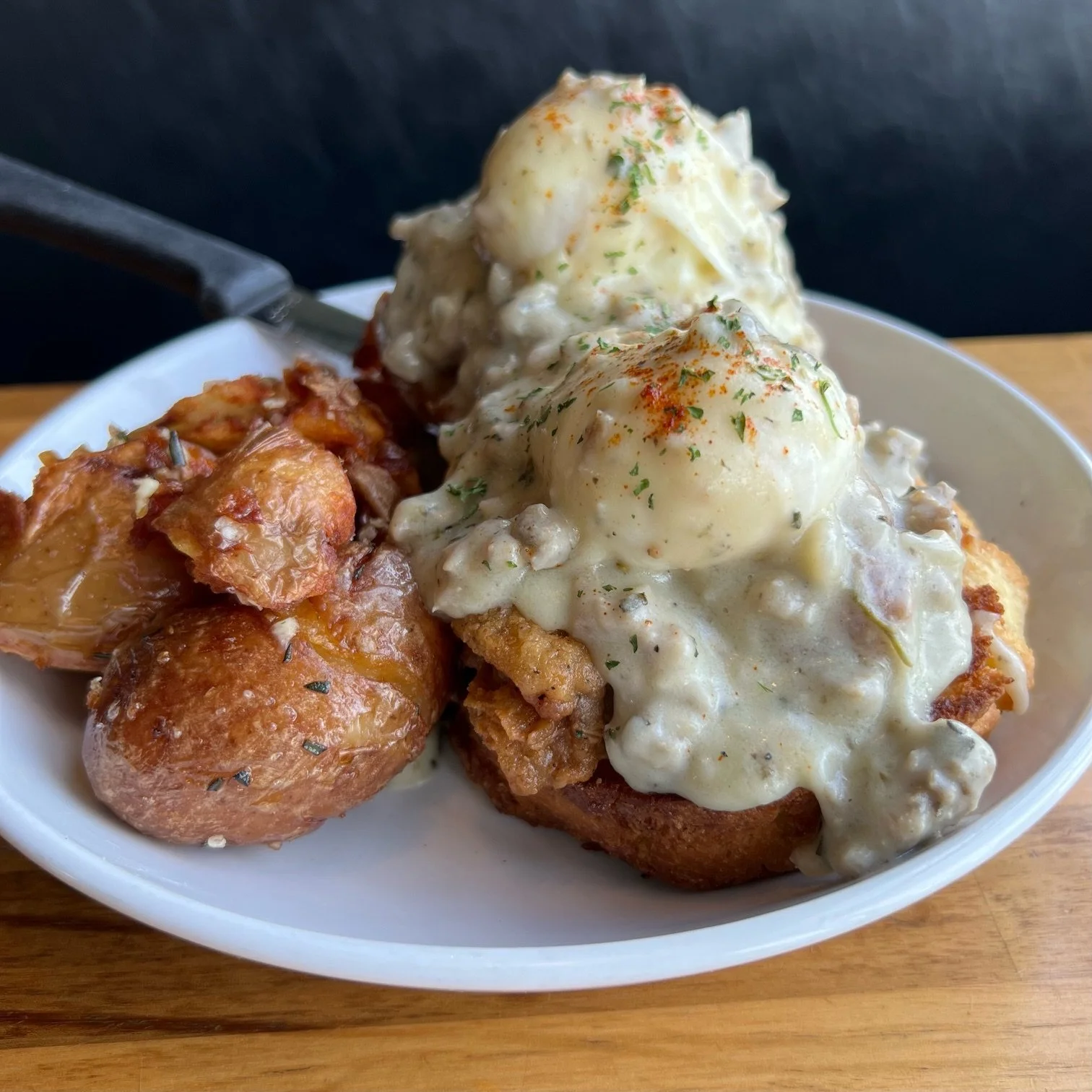 Country sausage and sage gravy on buttermilk biscuits served with smashed garlic rosemary potatoes. Add poached eggs