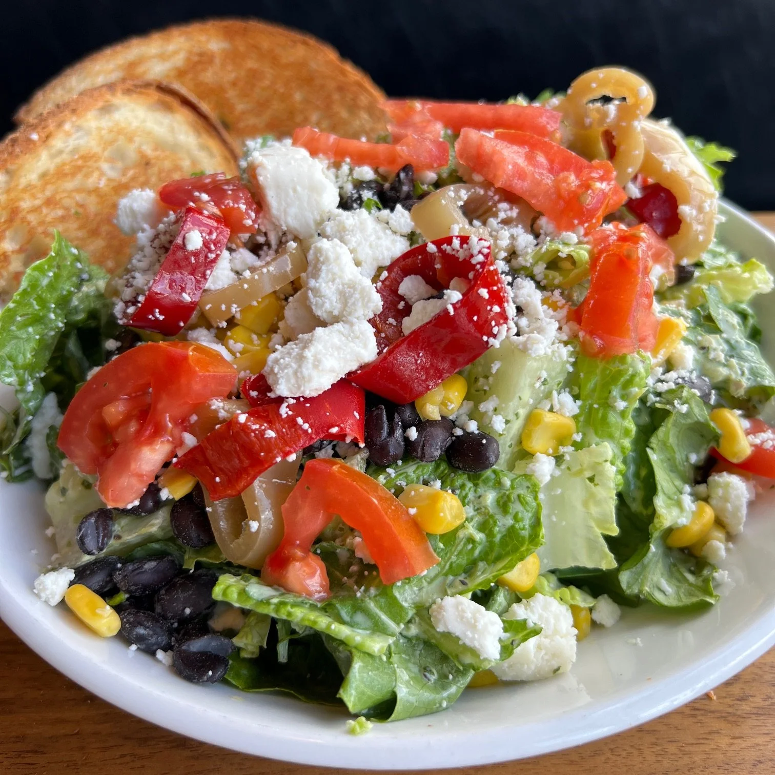 Arugula and Romaine lettuce tossed in our Cilantro Lime Dressing with black beans, corn, tomatoes, house pickled peppers and queso fresco. The dressing has a little spicy kick. Comes with a side of toast. GOES GREAT WITH OUR CHICKEN VERDE!